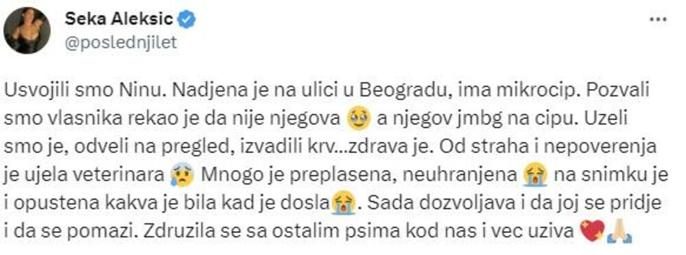 – Usvojili smo Ninu. Nađena je na ulici u Beogradu, ima mikročip. Pozvali smo vlasnika rekao je da nije njegova a njegov jmbg na čipu. Uzeli smo je, odveli na pregled, izvadili krv…zdrava je. Od straha i nepoverenja je ujela veterinara. Mnogo je preplašena, neuhranjena na snimku je i opuštena kakva je bila kad je došla. Sada dozvoljava i da joj se priđe i da se pomazi. Združila se sa ostalim psima kod nas i već uživa – napisala je Seka i objavila snimak na kom se vidi kako njeni sinovi, Jakov i Jovan, brinu o novom članu porodice.