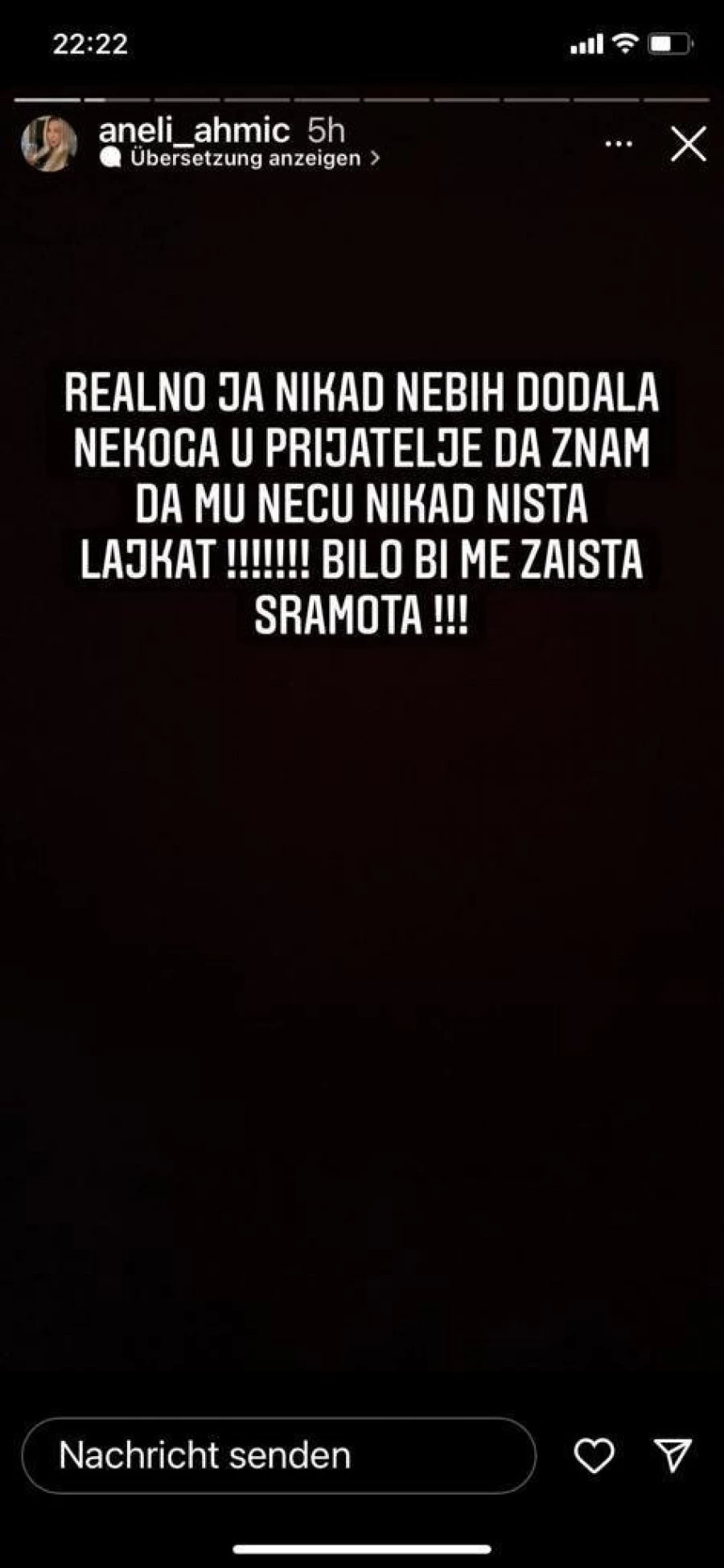 – Realno, ja nikad ne bih nekoga dodala za prijatelje, a da znam da mu neću ništa lajkovati. Bilo bi me sramota stvarno – napisala je Aneli, a potom je usledio novi story:
