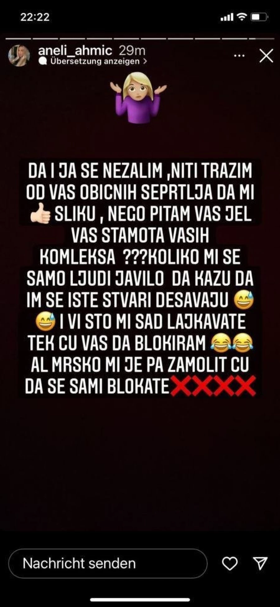– Da se razumemo, ja ne tražim od vas, običnih šeprtlja, da mi lajkujete slike, ali da li vas nije sramota svojih kompleksa? – nastavila je Aneli.