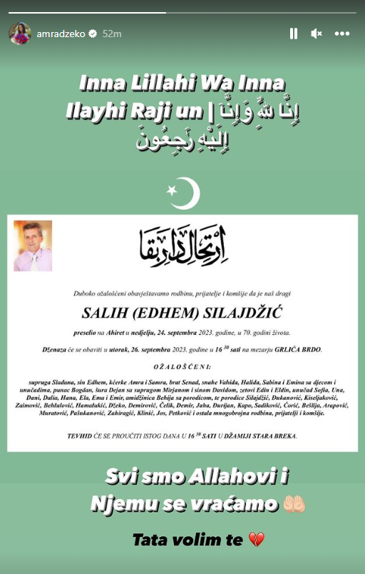 Na profilu na društvenim mrežama objavila je smrtovnicu svog oca, Saliha Silajdžića koji je preminuo u 70. godini života.