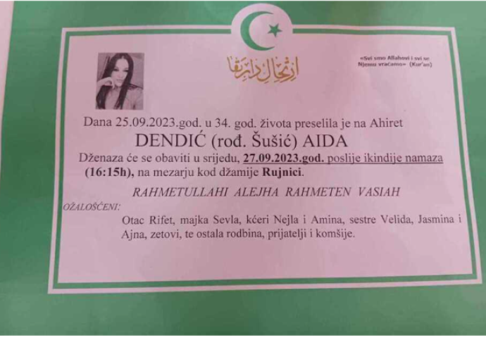 Ukop i dženaza će biti obavjeni na mezarju kod džamije Rujnici u Zavidovićima u 16:15 sati poslije ikindije-namaza.