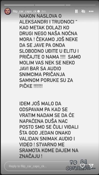 – Neka dušmana, šta imaju crkavati… Bez njih ne bi ni znali koliko nam je dobro. Oni su ti najverniji pratioci na putu do uspeha. – objavio je Filip Car na svom Instagram storiju.