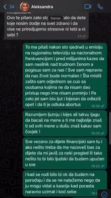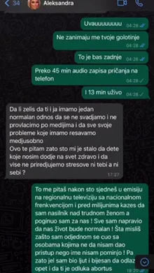 Da li želiš da ti i ja imamo jedan normalan odnos da se ne svađamo i ne provlačimo po medijima i da sve svoje probleme koje imamo rešavamo međusobno. Ovde te pitam zato što mi je stalo da dete koje nosim dođe na svet zdravo i da više ne priređujemo stresove ni tebi, a ni sebi – pitala je Aleks, na šta je Car odgovorio: