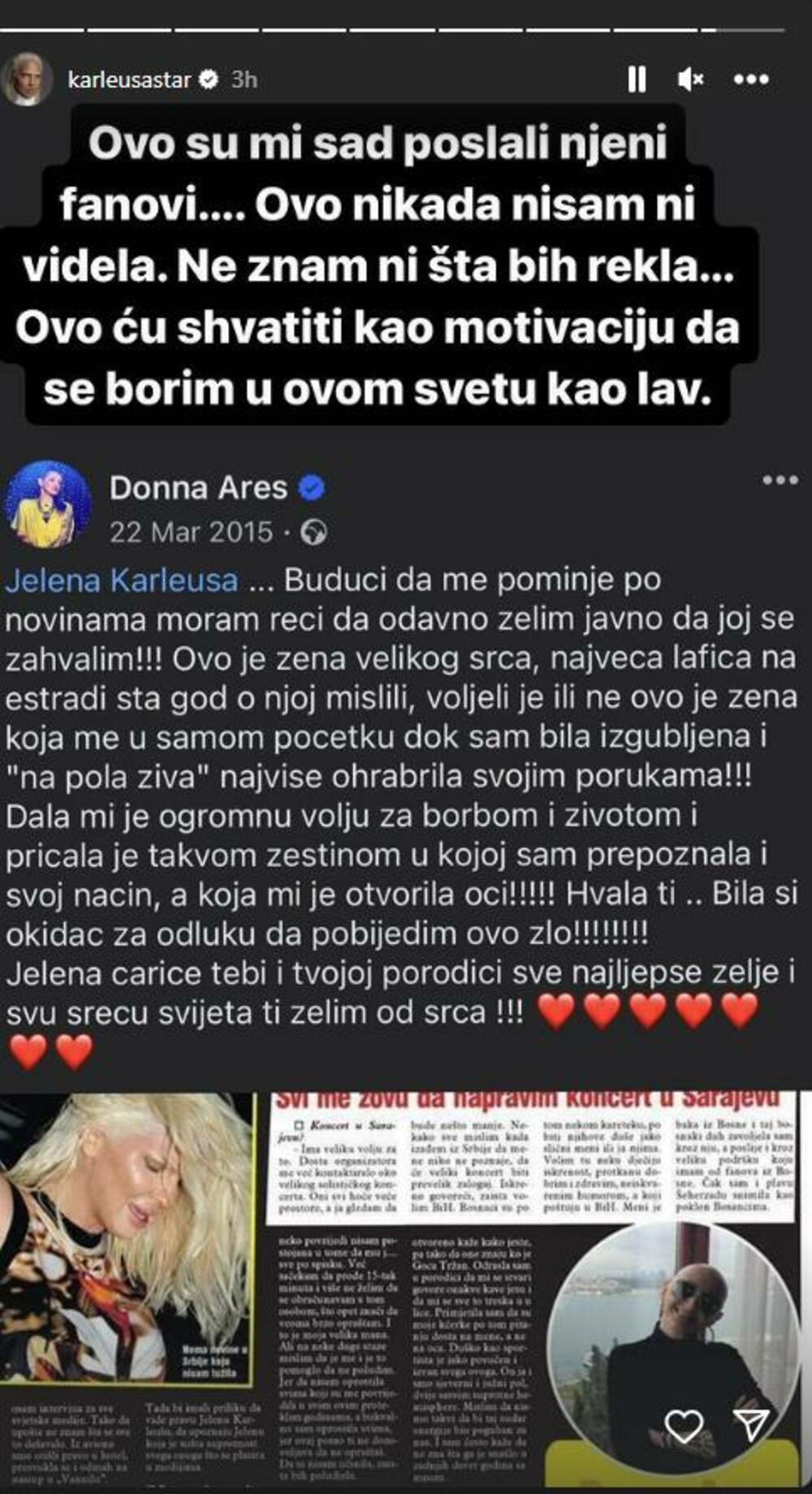 Karleuša je zatim objavila i skrinšot Donine stare objave, koju su joj poslali njeni fanovi – a riječi pokojne koleginice malo je reći da su ganule Jelenu.