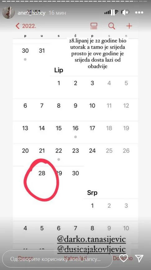od juna prošle godine na kojem se vidi da je tog 28. bio utorak, a ne sreda, što se vidi na prepisci.