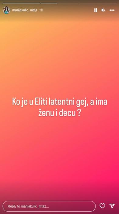 – Ko je u Eliti latentni gej, a ima ženu i decu? – napisala je Marija na Instagramu, pa dodala: