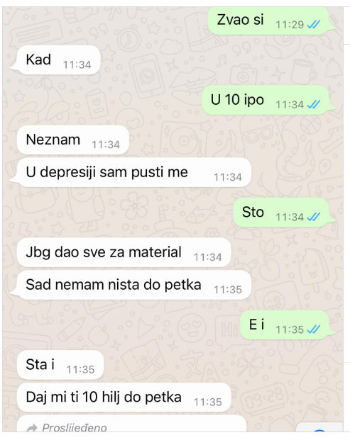 – Dao sam sve za materijal. Daj mi deset hiljada do petka – glasila je naredna Asminova poruka.