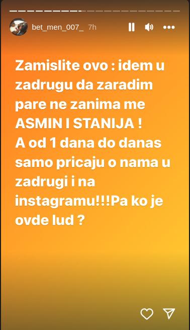 – Zamislite ovo: Idem u Zadrugu da zaradim pare ne zanima me Asmin i Stanija. A od 1. dana do danas samo pričaju o nama u Zadruzi i na Instagramu! Pa ko je ovde lud? – pitao se Asmin.