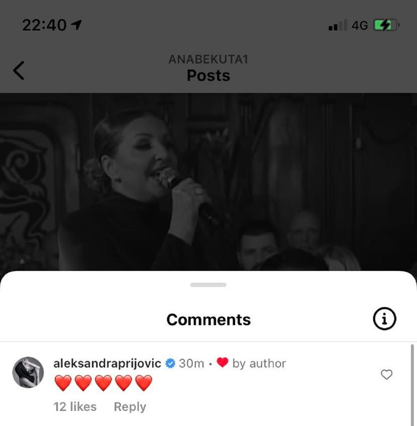 Njene reči dirnule su mnoge, a posebno mladu pevačicu Aleksandru Prijović, koja joj je među prvima ostavila komentar pun ljubavi. Ispod snimka ostavila je pet crvenih srca, a Bekuta je lajkovala njen komentar.