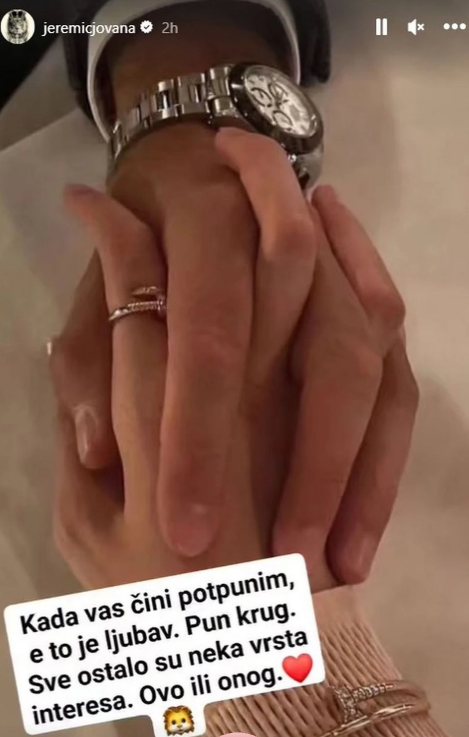 Kad vas čini potpunim, e to je ljubav. Pun krug. Sve ostalo su neka vrsta interesa. Ovog ili onog – napisala je Jovana i dodala emotikon srca i lava.