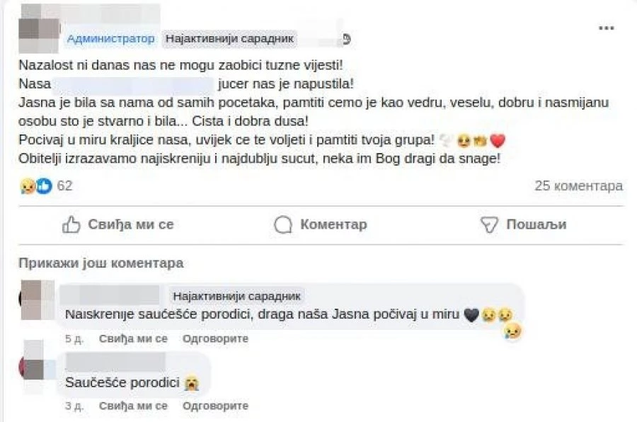 Jedna od administratorki grupe je podelila u grupi Janjuševe kraljice poruku koja je izrazila duboko žaljenje zbog gubitka J.Đ.