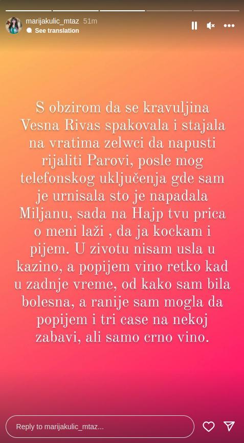 – S obzirom na to da se kravuljina Vesna Rivas spakovala i stajala na vratima želeći da napustu rijaliti “Parovi”, posle mog telefonskog uključenja gde sam je urnisala što je napadala Miljanu, sada na Hajp televiziji priča o meni laži, da ja kockam i pijem. U životu nisam ušla u kazio, a popijem vino retko kad u zadnje vreme, od kako sam bila bolesna, a ranije sam mogla da popijem i tri čaše na nekoj zabavi, ali samo crno vino.