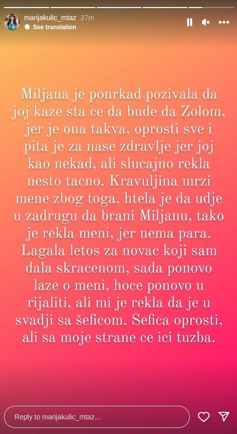 – Miljana je ponekad pozivala da joj kaže šta će da bude da Zolom, jer je ona takva. Oprosti sve i pita je za naše zdravlje jer joj kao nekad, ali slučajno, rekla nesto tačno. Kravuljina mrzi mene zbog toga, htela je da uđe u “Zadrugu” da brani Miljanu, tako je rekla meni, jer nema para. Lagala letos za novac koji sam dala skraćenom, sada ponovo laže o meni, hoće ponovo u rijaliti, ali mi je rekla da je u svađi sa Šeficom. Šefice, oprosti, ali sa moje strane će ići tužba – stoji u objavama Marije Kulić.