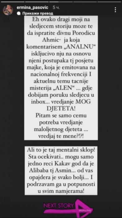 – Eh, ovako, dragi moji, na sledećem storiju možete da ispratite divnu porodicu Ahmić. Ja koja komentarišem Analnu isključivo na osnovu njenih postupaka, tj. posetu majke, koja je emitovana na nacionalnoj frekvenciji i aktuelnu temu, tačnije misterija “Alen”, gde dobijam poruku sledeću u inboks, vređanje mog deteta. Pitam se samo čemu potreba vređanja maloletnog deteta. Vređajte mene. Ali to je taj mentalni sklop. Šta očekivati? Mogu samo jedno reći, kakav god da je Alibaba, tj. Asmin, od vas opajdara je svako bolji, i podržavam ga u potpunosti u svim namerama – napisala je Ermina na Instagramu, a zatim objavila i poruku koju je dobila: