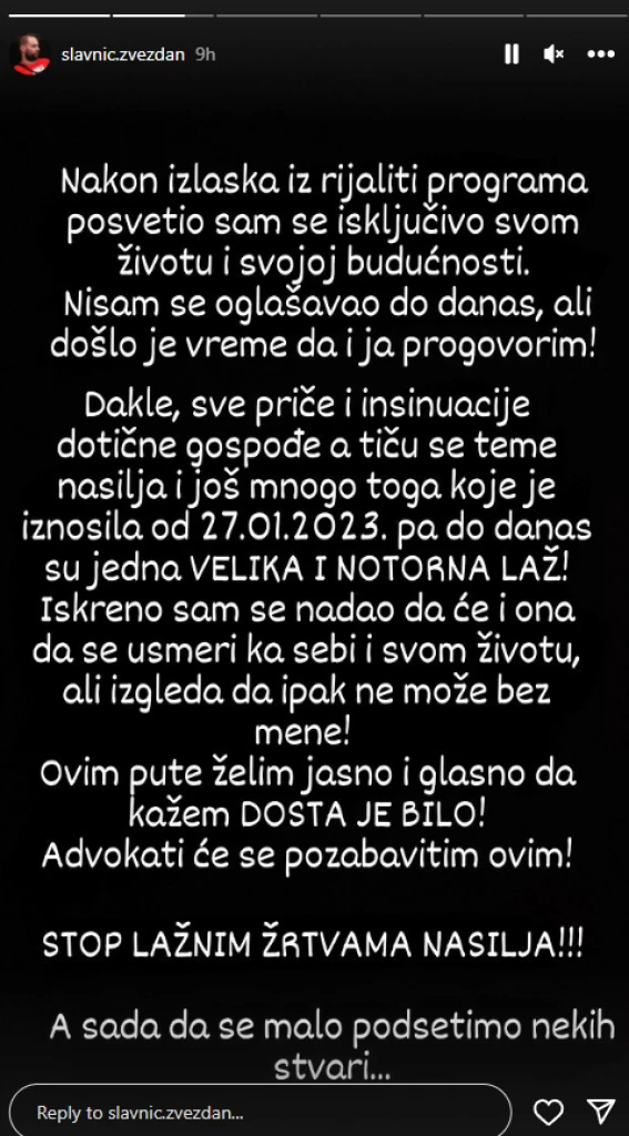 – Nakon izlaska iz rijaliti programa, posvetio sam se isključivo svom životu. Nisam se oglašavao do danas, ali je došlo vreme da i ja progovorim. Dakle, sve priče i insinuacije dotične gospođe, a tiču se teme nasilja i još mnogo toga, koje je iznosila od 27.01.2023, pa sve do danas su jedna velika i notorna laž. Iskreno sam se nadao da će se i ona usmeriti ka sebi i svom životu, ali izgleda da ipak ne može bez mene. Ovim putem želim da kažem jasno i glasno DOSTA JE BILO. Moji advokati će se pozabaviti time. Stop lažnim žrtvama nasilja – napisao je Zvezdan putem svog Instagram profila.