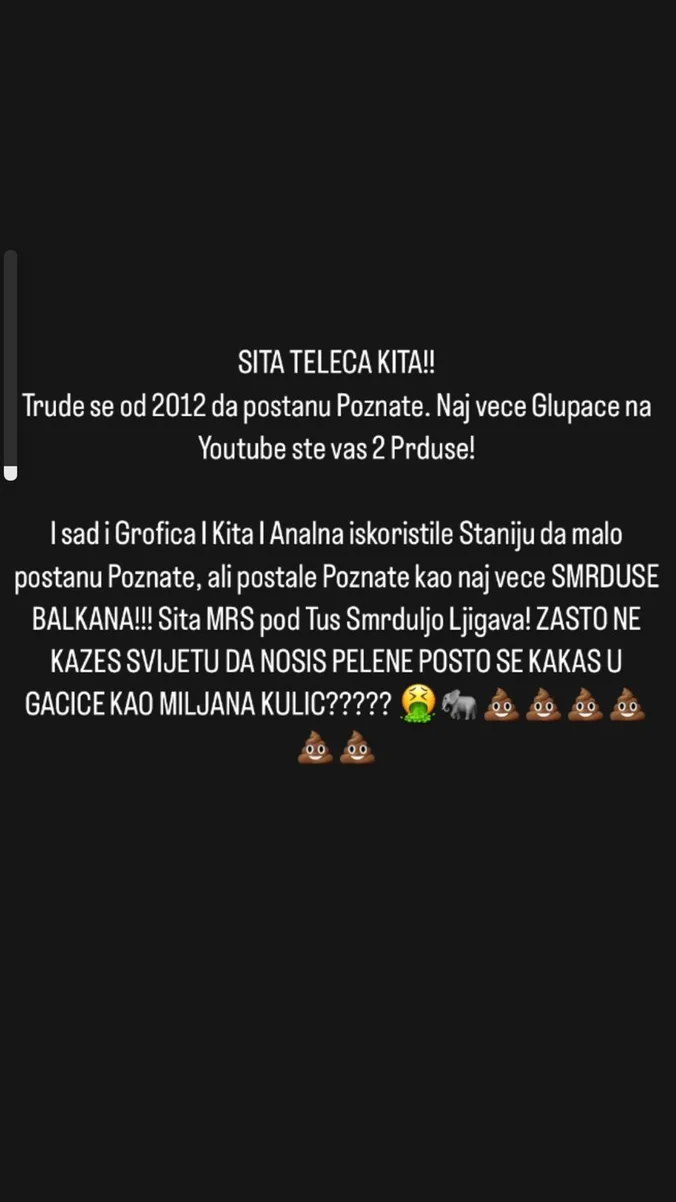 – Sita, teleća ki*a!! Trude se od 2012 da postanu poznate. Najveće glupače na youtube ste vas dve pr**še. I sad i Grofica i Ki*a i Anal*a iskoristile Staniju da malo postanu poznate, ali postale poznate kao najveće smrduše balkana! Sita m*š pod ruš smrduljo ljigava! Zašto ne kažeš svetu da nosiš pelene pošto se kak*š u gaćice kao Miljana Kulić?! – napisao je on uz razne emotikone.