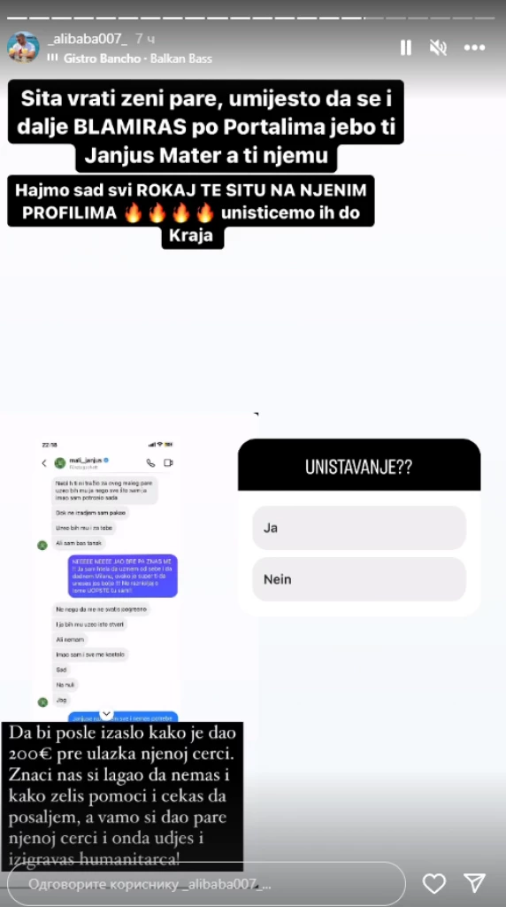 Iako nije jasno o čemu se tačno radi, spominje se novac, koji Janjuš u tom momentu nije imao da pozajmi, što se može pročitati u četu, koji je objavio Asmin na svom Instagram profilu.
