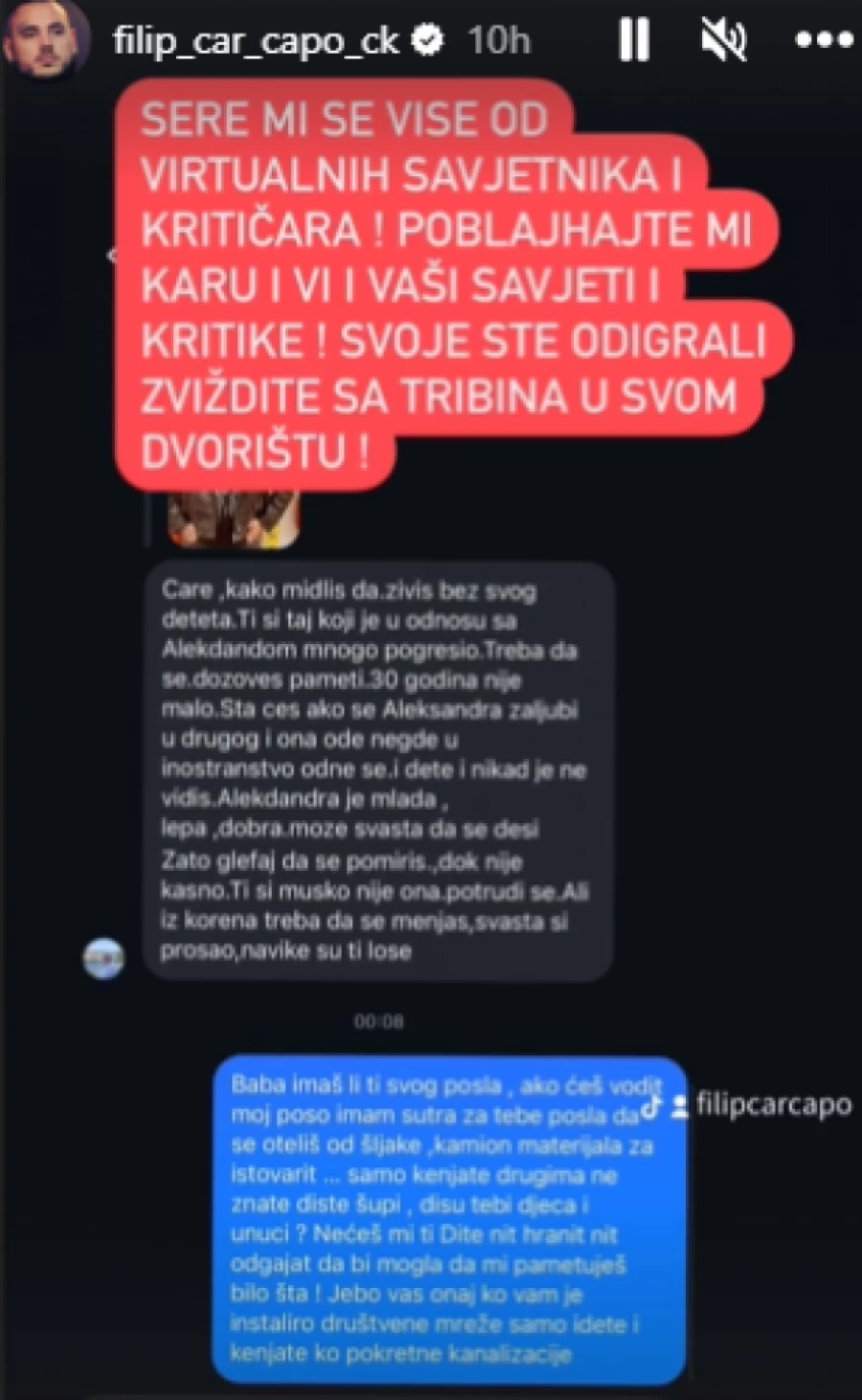– Se*re mi se više od virtuelnih savetnika i kritičara! Poblajhajte mi ka*u i vi i vaši saveti i kritike! Svoje ste odigrali, zviždite sa tribina u svom dvorištu – poručio je Car u svojoj objavi u Instagram priči.