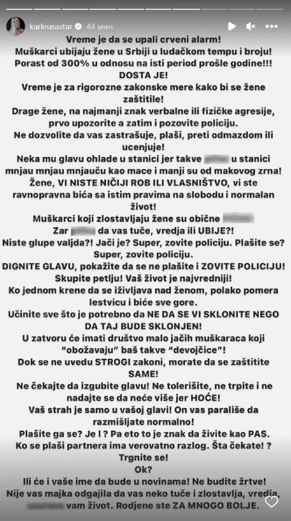 – Vreme je da se upali crveni alarm! Muškarci ubijaju žene u Srbiji u ludačkom tempu i broju! Porast od 300% u odnosu na isti period prošle godine!!! DOSTA JE! Vreme je za rigorozne zakonske mere kako bi se žene zaštitile! Drage žene, na najmanji znak verbalne ili fizičke agresije, prvo upozorite, a zatim i pozovite policiju. Ne dozvolite da vas zastrašuje, plaši, preti odmazdom ili ucenjuje!