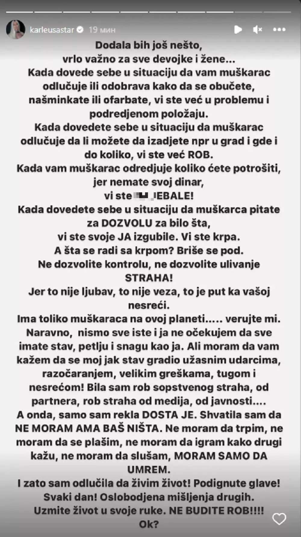 – Dodala bih još nešto, vrlo važno za sve devojke i žene… Kada dovedete sebe u situaciju da vam muškarac odlučuje ili odobrava kako da se obučete, našminkate ili ofarbate, vi ste već u problemu i podređenom položaju. Kada dovedete sebe u situaciju da muškarac odlučuje da li možete da izađete npr u grad ili gde i koliko, vi ste već ROB. Kada vam muškarac određuje koliko ćete potrošiti, jer nemate svoj dinar, vi ste NAJ*BALE! Kada dovedete sebe u situaciju da muškarca pitate za DOZVOLU za bilo šta, vi ste svoje JA izgubile.