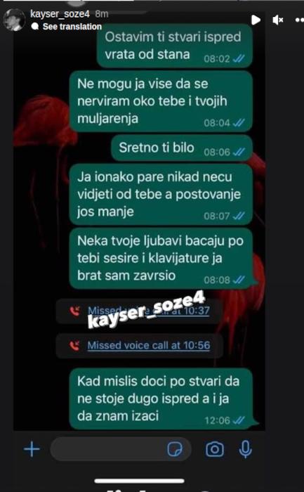 Ostavljam ti stvari ispred vrata od stana. Ne mogu ja više da se nerviram oko tebe i tvojih muljarenja – glasi još jedna poruka, na koju Janjuš ne odgovara.