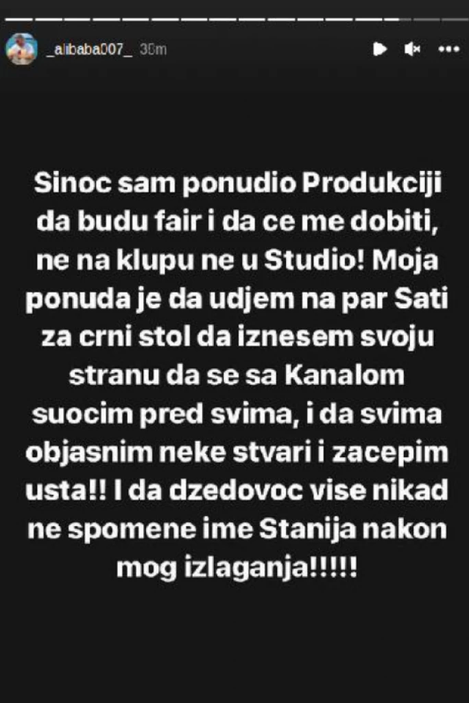 – Sinoć sam ponudio produkciji da će me dobiti, ne na klupi, ne u studiju… Moja ponuda je da uđem na par sati, da za crnim stolom iznesem svoju stranu priče, da se sa Kanalom (Aneli) suočim pred svima i da objasnim neke stvari i začepim usta – započeo je Asmin, pa nastavio: