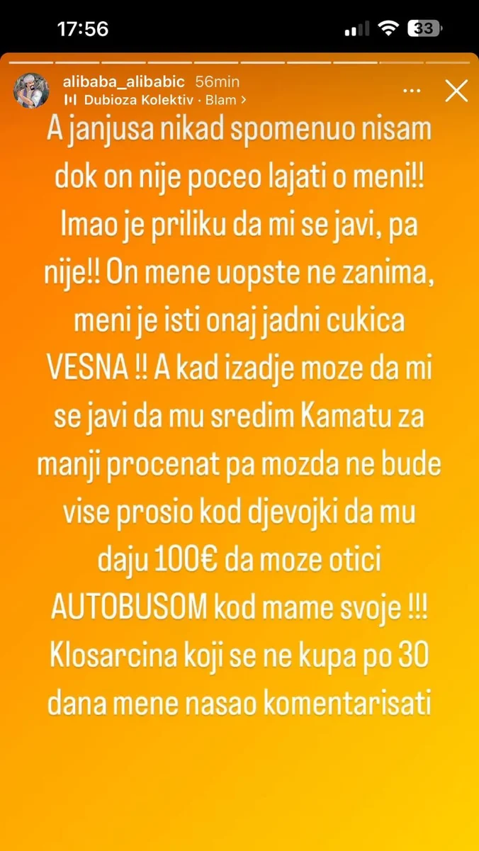 Janjuša nikad nisam spomenuo, dok on nije počeo lajati o meni. Imao je priliku da mi se javi, pa nije. On me uopšte ne zanima, meni je isti onaj jadni cukica Vesna, a kad izađe može da mi se javi da mu sredim kamatu za manji procenat, pa možda ne bude više prosio kod devojki da mu daju 100 eura da može otići autobusom kod svoje mame. Klošarčina koji se ne kupa po 30 dana, našao mene komentarisati – poručio je Asmin.