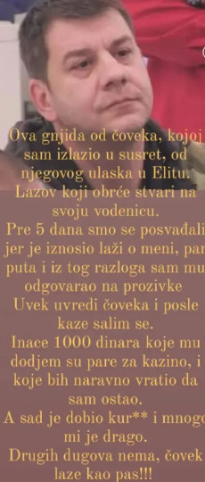 – Ova gnjida od čoveka, kojoj sam izlazio u susret, od njegovog ulaska u “Elitu”… Lažov koji obrće stvari na svoju vodenicu. Pre pet dana smo se posvađali jer je iznosio laži o meni, par puta i iz tog razloga sam mu odgovarao na prozivke. Uvek uvredi čoveka i posle kaže: “Šalim se”. Inače, 1000 dinara koje mu dođem su pare za kazino i koje bih, naravno, vratio da sam ostao – rekao je o dugu, pa dodao: