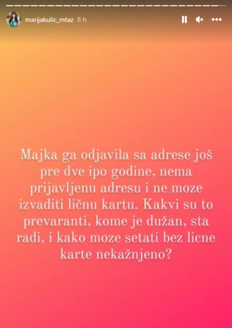 – Majka da odjavila sa adrese još pre dve i po godine, nema prijavljenu adresu i ne može izvaditi ličnu kartu. Kakvi su to prevaranti! Kome je dužan, šta radi i kako može šetati bez lične karte nekažnjeno? – napisala je Marija Kulić o Nenadu Macanoviću Bebici, pa nastavila: