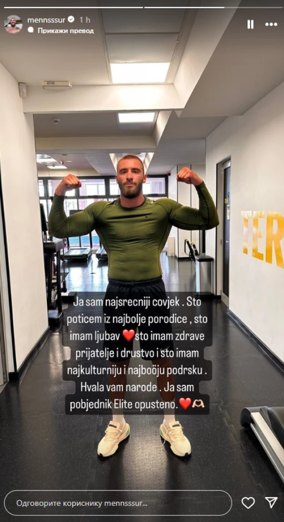 – Ja sam najsrećniji čovek, što potičem iz najbolje porodice, što imam ljubav, zdrave prijatelje i društvo, što imam najkulturniju podršku. Ja sam pobednik Elite – napisao je Mensur Ajdarpašić uz fotografiju.