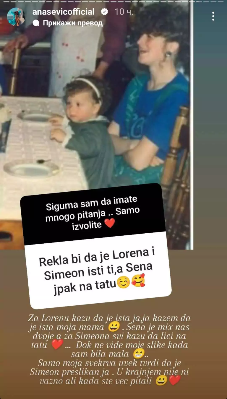 Pjevačici su postavljali pitanja u vezi djece, porođaja, linije… A, kada su pitali na koga liče njena deca Ana je postavila svoju fotografiju iz djetinjstva na kojoj se vidi koliko njena starija ćerka Lorena, koju je dobila u braku sa Darkom Lazićem, liči na nju.