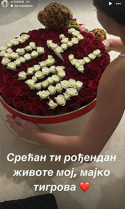 Veljko je objavio na svom Instagram storiju kako je iznenadio svoju izabranicu punom kutijom crvenih ruža, a iznad njih je belim ružama ispisano: “Volim te”, ali i tigrićem koji je bio prikačen uz cveće.