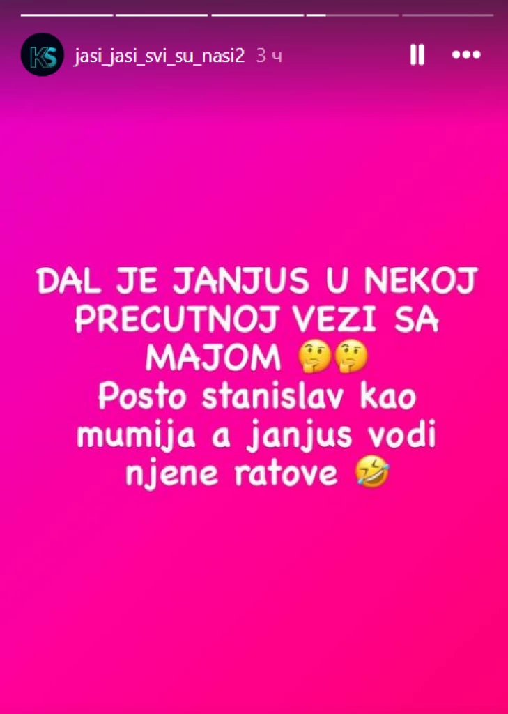 – Da li je Janjuš u nekoj prećutnoj vezi sa Majom? Pošto Stanislav kao mumija, a Janjuš vodi njene ratove – glasi status koji je pokrenuo ovu teoriju.