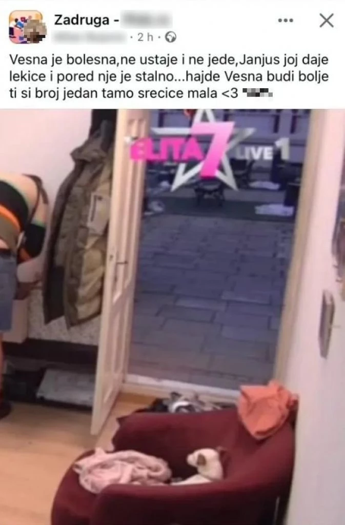 – Vesna je bolesna, ne ustaje i ne jede, Janjuš joj daje lekiće i pored nje je stalno… Hajde, Vesna, budi bolje, ti si broj jedan tamo, srećice mala – stoji u objavi koja je osvanula na pomenutoj društvenoj mreži.