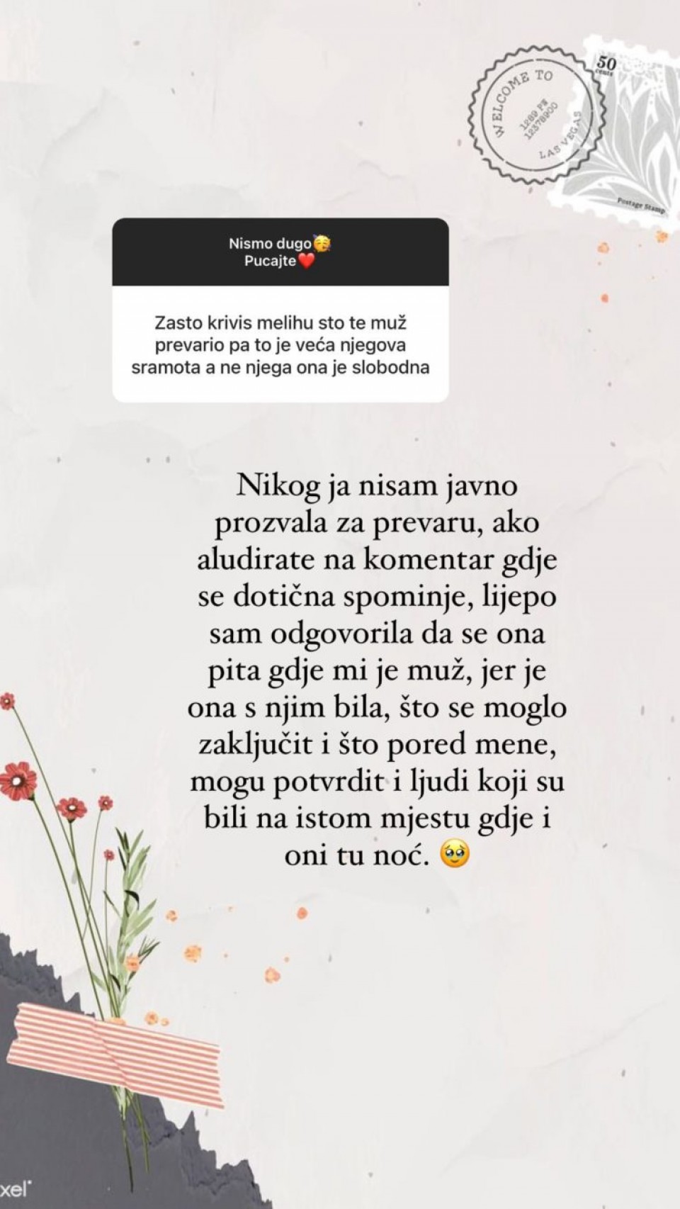 – Nikoga ja nisam javno prozvala za prevaru, ako aludirate na komentar gdje se dotična spominje, lijepo sam odgovorila da se ona pita gdje mi je muž, jer je ona s njim bila, što se moglo zaključiti i što pored mene mogu potvrditi i ljudi koji su bili na istom mjestu gdje i oni tu noć – odgovorila je popularna Dada.