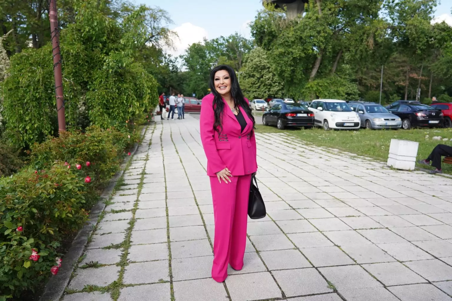 Na sebi je imala sako roze boje, pantalone u istoj boji, i običnu crnu bluzu koju je uklopila sa crnom torbom.