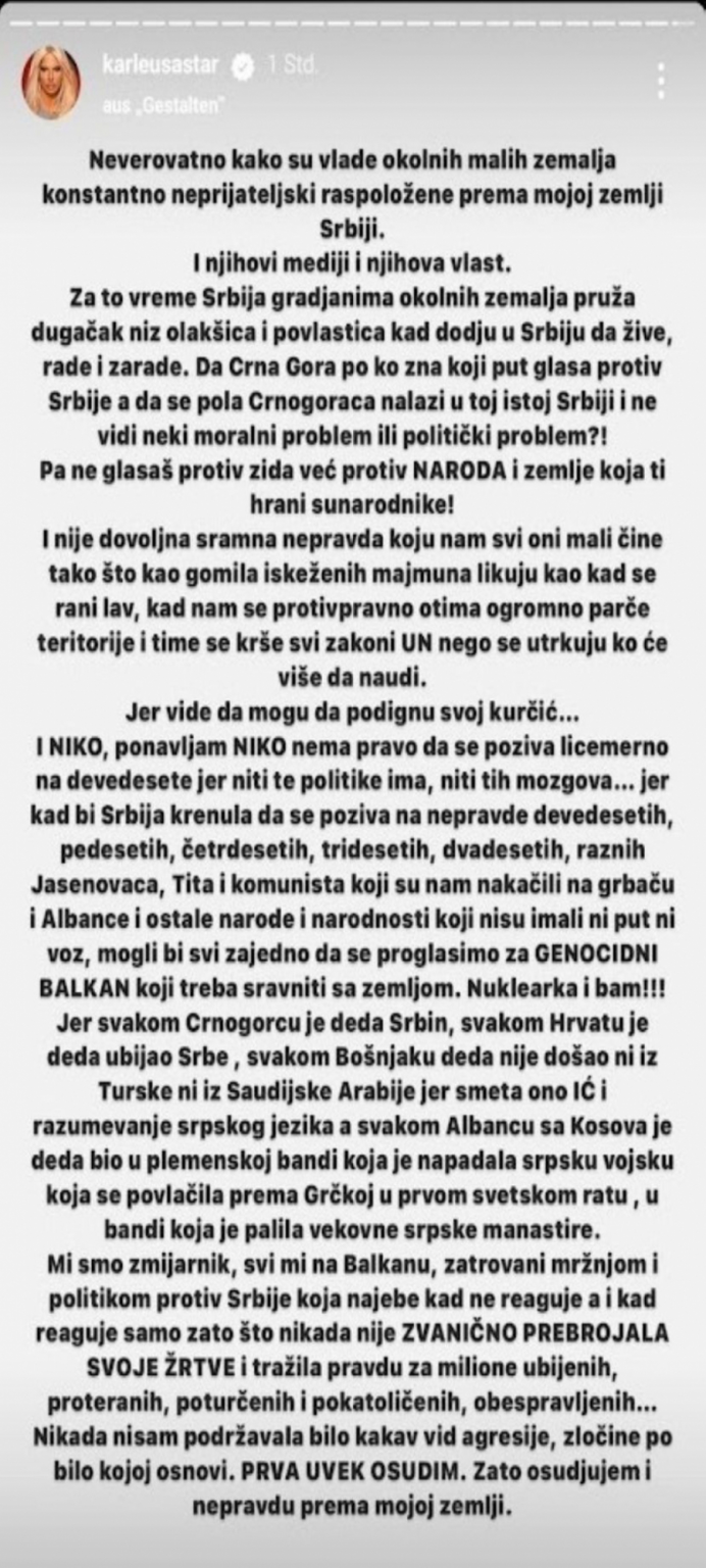 “Nevjerojatno kako su vlade okolnih zemalja konstantno neprijateljski raspoložene prema mojoj zemlji Srbiji. I njihovi mediji i njihova vlast. Za to vrijeme Srbija pruža građanima tih zemalja niz olakšica i povlastica kad dođu u Srbiju da žive, rade i zarade,” izjavila je Karleuša.