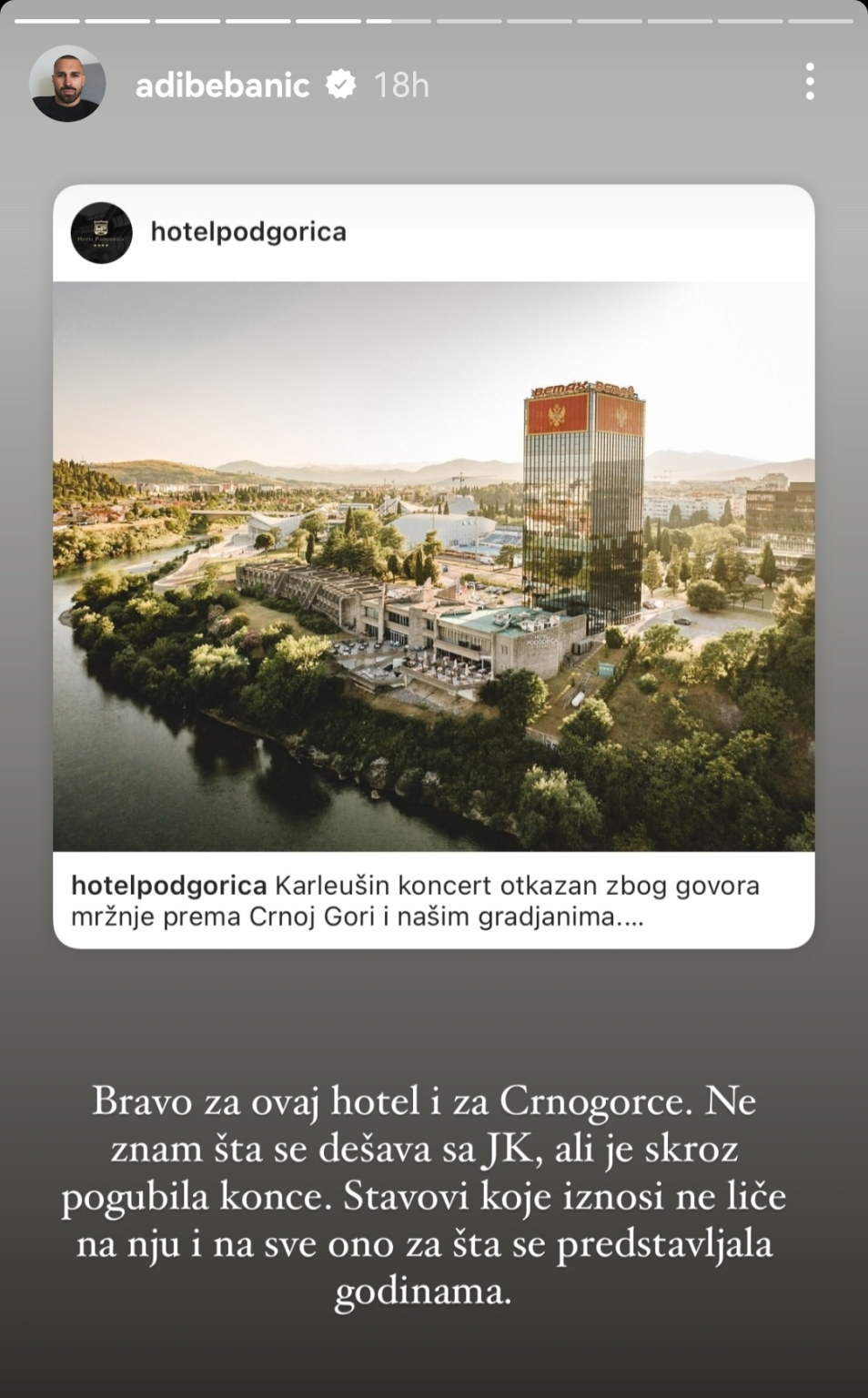 “Bravo za ovaj hotel i za Crnogorce. Ne znam šta se dešava sa JK, ali je skroz pogubila konce. Stavovi koje iznosi ne liče na nju i na sve ono za šta se predstavljala godinama”, napisao je Adi.