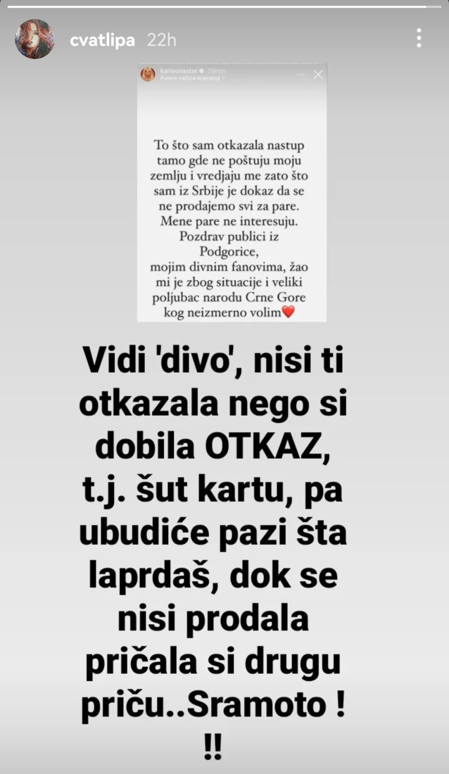 “Karleušin koncert otkazan zbog govora mržnje prema Crnoj Gori i našim gradjanima.