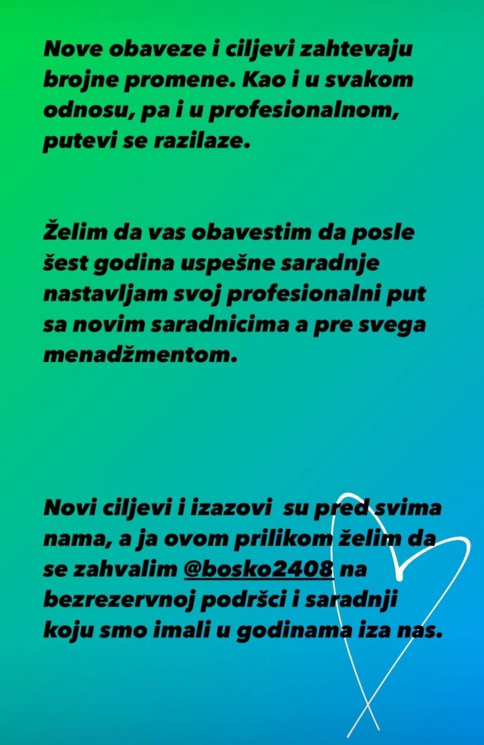 Naravno, starom menadžeru Bošku pjevačica se neizmjerno zahvalila na podršci i saradnji koju su imali proteklih godina, a novom poručila da još uvijek ne zna šta ga čeka.