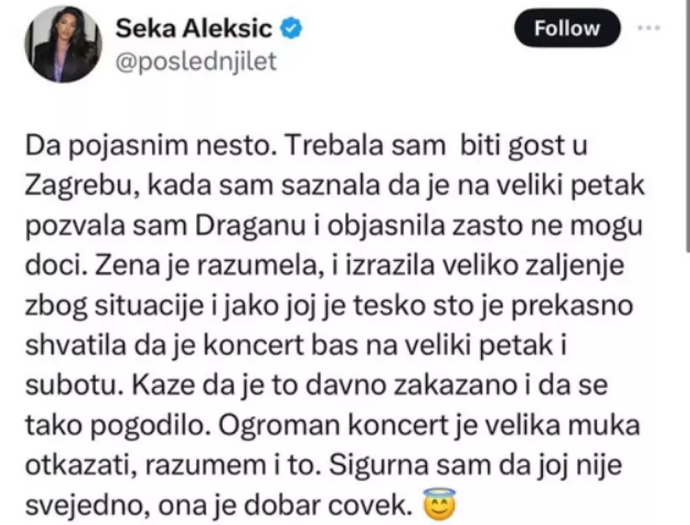 “Da pojasnim nešto. Trebalo je da budem gost u Zagrebu, kada sam saznala da je na Veliki petak, pozvala sam Draganu i objasnila zašto ne mogu doći. Žena je razumela i izrazila veliko žaljenje zbog situacije i jako joj je teško što je prekasno shvatila da je koncert baš na Veliki petak i subotu”, napisala je Seka i dodala: