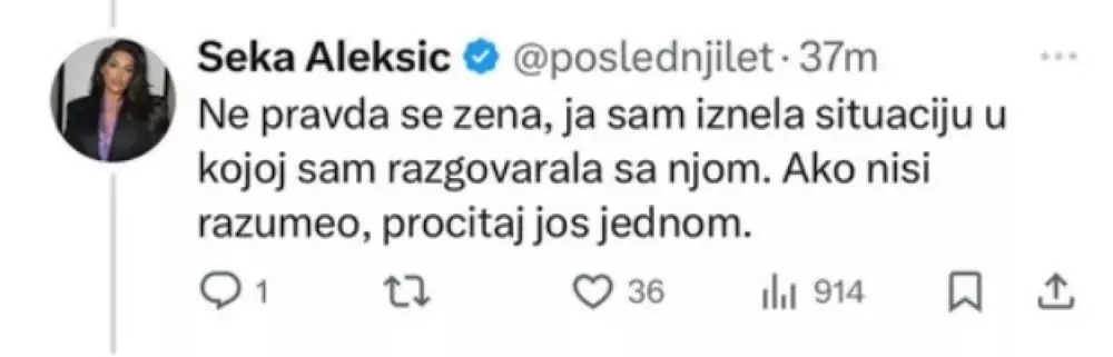 Ovaj potez izazvao je buru na društvenim mrežama, a kada su je “napali” zbog “opravdanja”, Seka je dopisala: