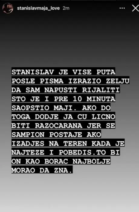 – Stanislav je više puta posle pisma izrazio želju da sam napusti rijaliti, što je i pre 10 minuta saopštio Maji. Ako do toga dođe ja ću lično biti razočarana jer se šampion postaje ako izađeš na teren kada je najteže i pobediš, to bi on kao borac najbolje trebao da zna – glasila je objava na tom profilu.