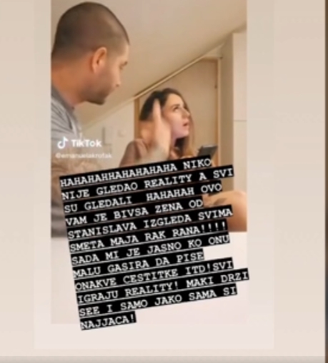 Na društvenim mrežama danas se pojavio snimak bivše žene Stanislava Krofaka, kako se snima uz jedan popularni zvuk na TikToku iz “Zadruge” i to baš svađu Maje Marinković i Marka Janjuševića Janjuša. Ovaj video odmah je podelio i Taki Marinković na Majin profil i uz to uputio brutalnu poruku, a onda i svojoj mezimici javno poručio da je sama najjača i da joj dečko nije potreban.