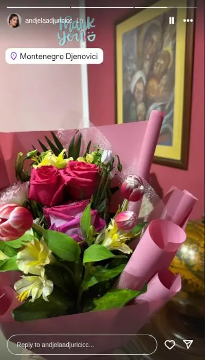 Đuričićeva je na storiju objavila fotografiju na kojoj je raskošni buket ruža, a označila je i lokaciju “Đenovići”