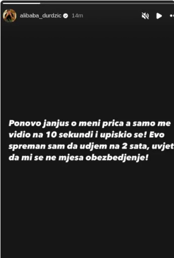 – Ponovo Janjuš o meni priča, a samo me je video na deset sekundi i upi*kio se! Evo spreman sam da uđem na dva sata, uslov je da mi se ne meša obezbeđenje! – obratio se čelnicima Pinka Asmin putem storija na društvenoj mreži Instagram.