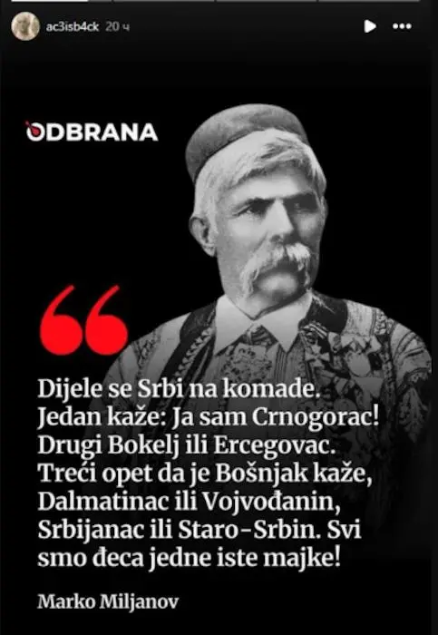 – Dijele se Srbi na komade. Jedan kaže: Ja sam Crnogorac! Drugi Bokelj ili Ercegovac. Treći opet da je Bošnjak kaže, Dalmatinac ili Vojvođanin, Srbijanac ili Staro-Srbin. Svi smo đeca jedne iste majke! – glasi rečenica Marka Miljanova koju je Veljko Ražnatović podelio na svom Instagram nalogu.