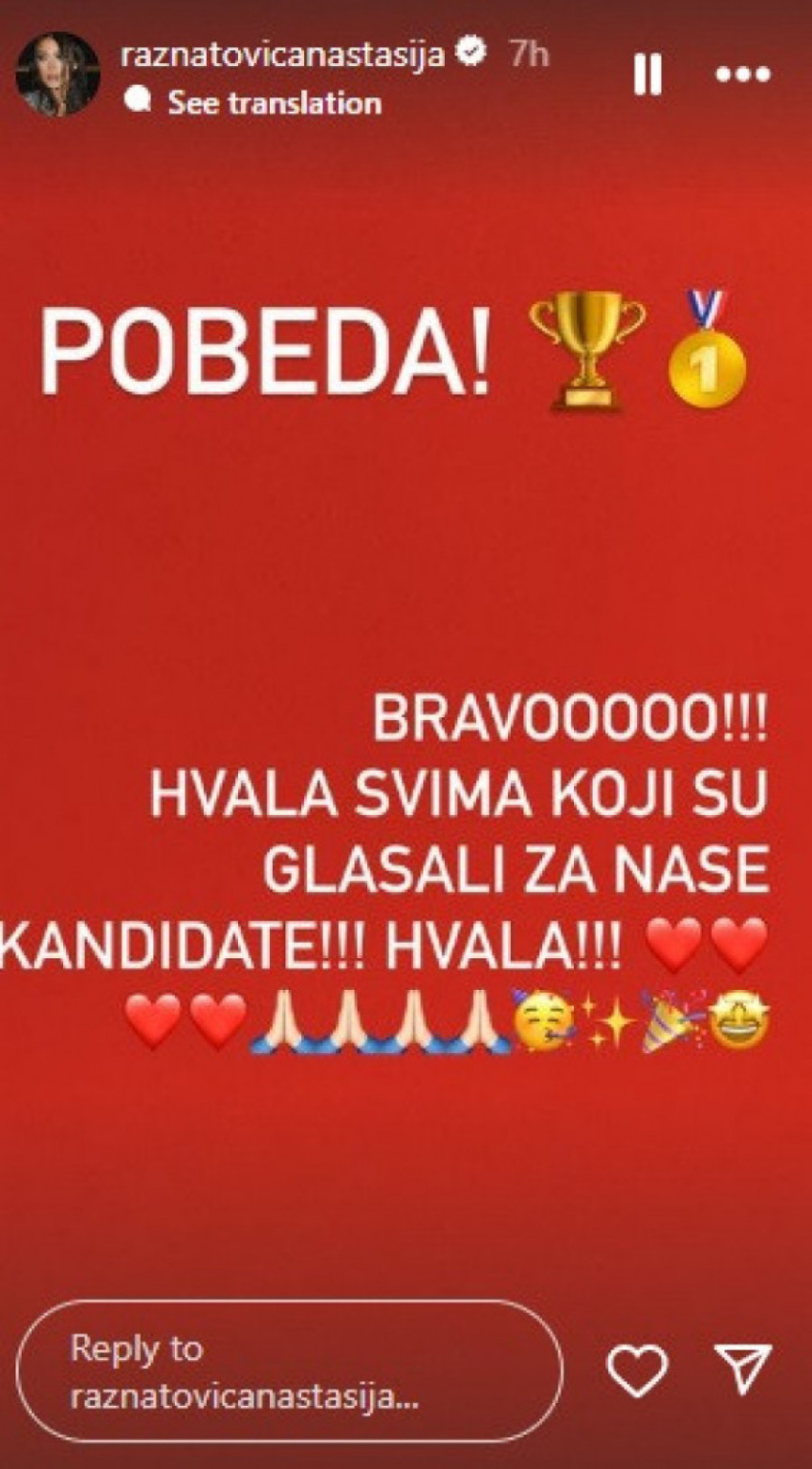Lepe vesti potvrdila je i Anastasija Ražnatović na svom Instagram profilu.