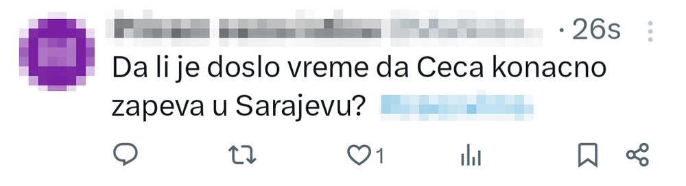 “Da li je to konačno došao momenat da Ceca zapeva u Sarajevu?”, “Kad počinje prodaja Cecinih karata za sarajevsku Zetru?”, “Oo, da li čemo konačno dočekati Cecu u Sarajevu?” – pisali su ushićeni obožavao na društvenoj mreži Iks.