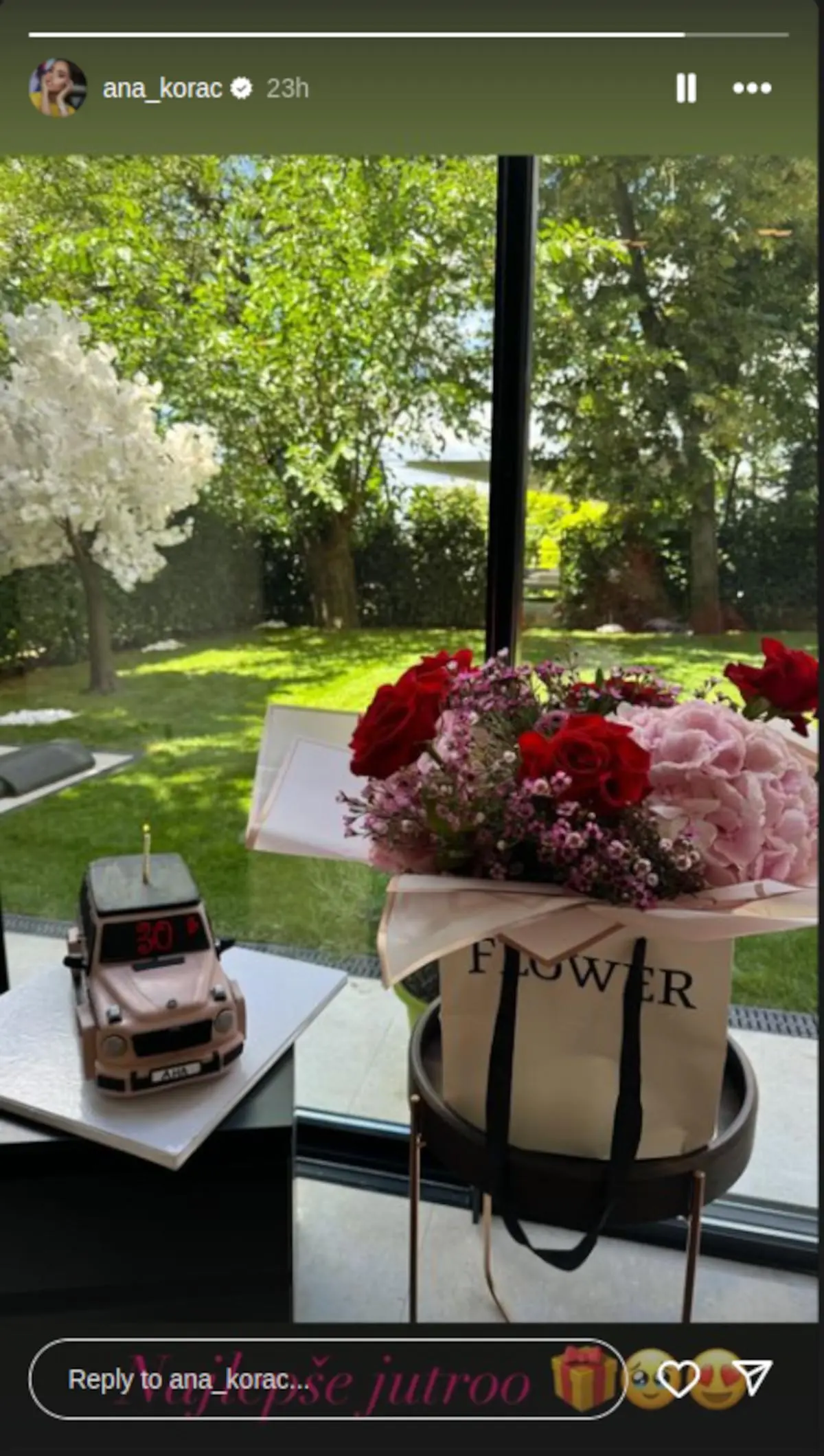 Ana je juče proslavila jubilarni 30. rođendan, a na Instagramu je osvanula i fotografija jednog dela poklona. Slavljenica je dobila raskošni buket cveća, pored kojeg je stajala rođendanska torta u obliku Mercedesa G klase, kakav auto inače vozi, a čija se cena kreće i do 270.000 evra.